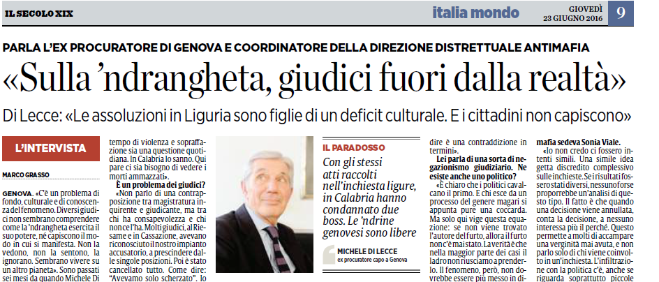 Intervista del Secolo XIX al Dr. Michele Di Lecce, già procuratore capo di Genova.